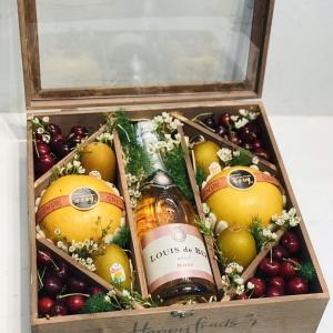 Gift box includes: - Royal - 2 Le Forms - 4 Golden Kiwis - Cherry Wooden box with lock, accessories, cards, decorative bows. Seasonal equivalent substitute fruit. Box size: 35 x 35 x height 10 cm
